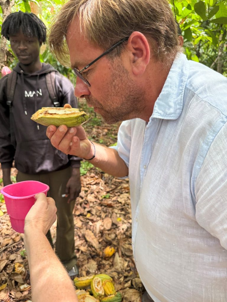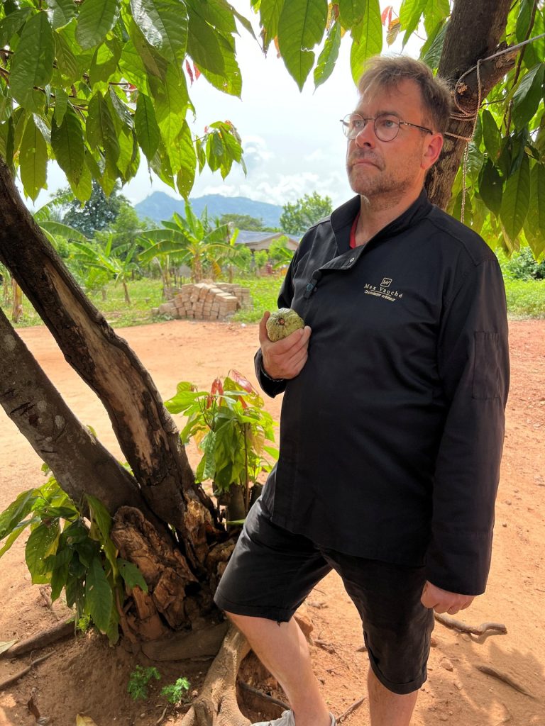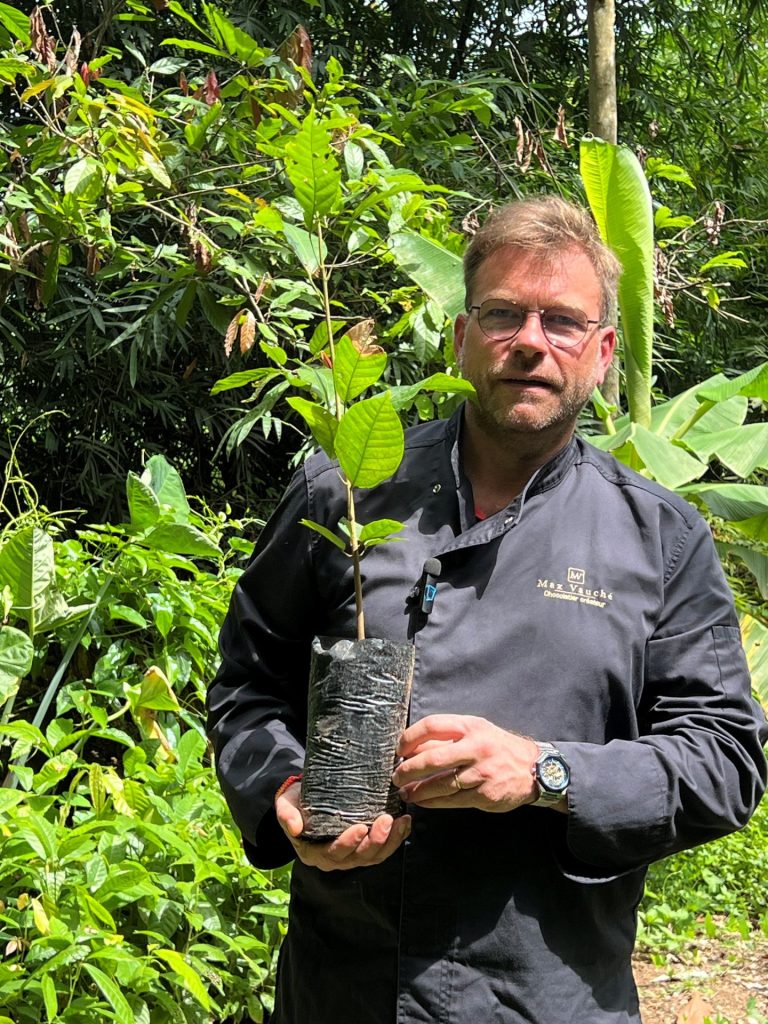 Lors d’un voyage à Sao Tomé, Max Vauché a rencontré la population locale. Il a choisi sa plantation et son planteur de cacao et a investi dans du matériel pour la récolte du cacao afin d’aider et de favoriser les conditions de travail des agriculteurs.
